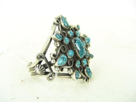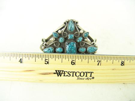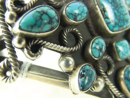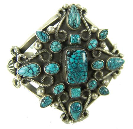 Circa 1970s, Outstanding silver cuff bracelet with fine rope and scroll design and set with seventeen exquisite square, rectangular, round, oval, and teardrop shaped matching #8 spiderweb turquoise stones. Very good condition. 5" x 2-1/2" + 1-3/8" gap