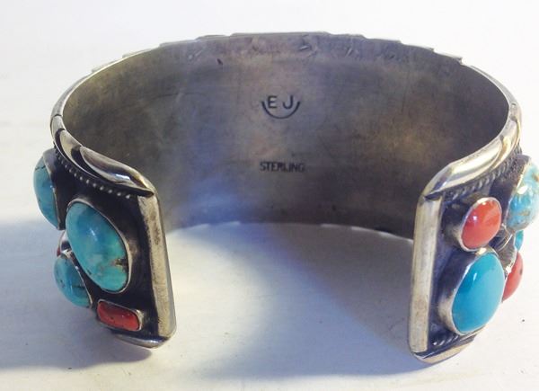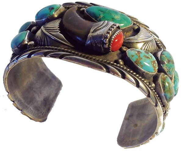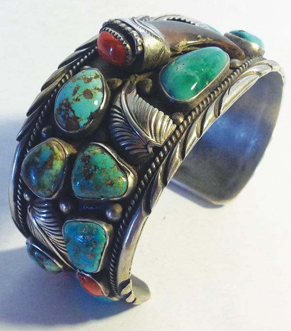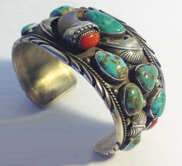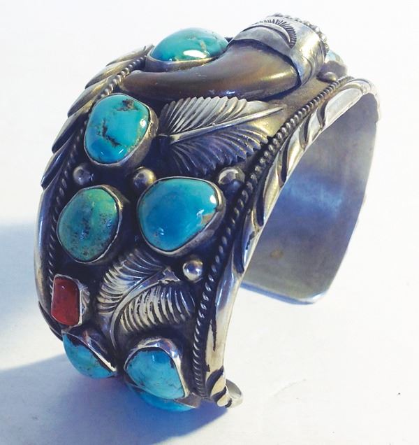 Quality, all silver cuff bracelet with fine leaf and file work, turquoise and coral stones, and a single bear claw in the center. Very good condition.Ca. 1980s6" + 1-1/2" x 1-1/2"