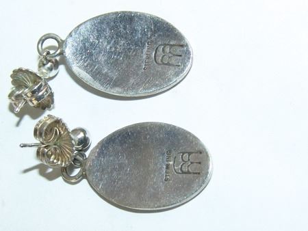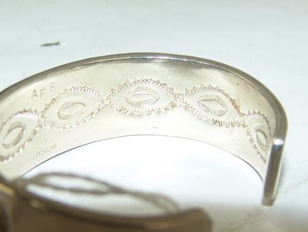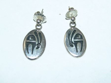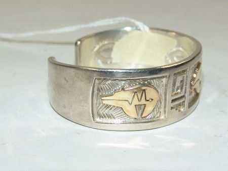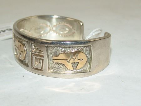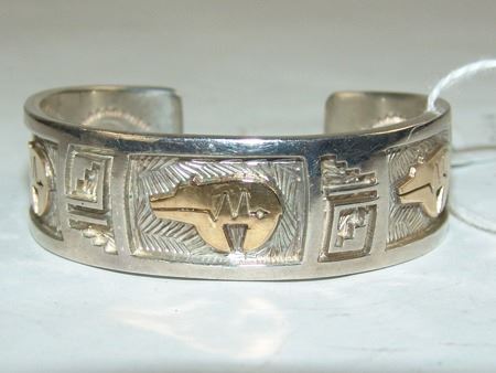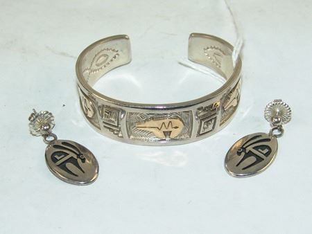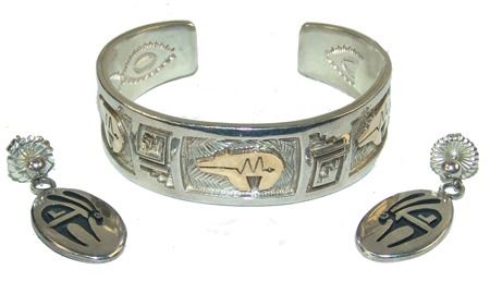 Ca. 1970s-1990s, Exquisite silver overlay cuff bracelet with three inset 14KT gold heartline bear figures, plus a pair of similar (Hopi) overlay earrings with hallmark. 5" + 7/8" x 3/4"