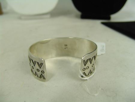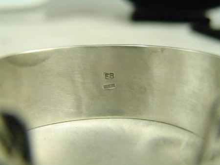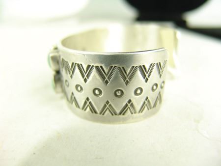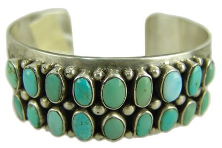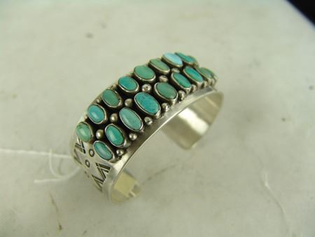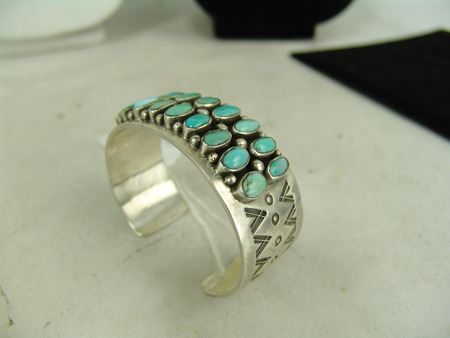 Ca. 1980s, Vintage heavier gauge four-band all-silver bracelet with dot accents and 18 oval turquoise stones. Very good condition, signed "EB." 5-7/8" + 1-1/4" x 1-1/8"