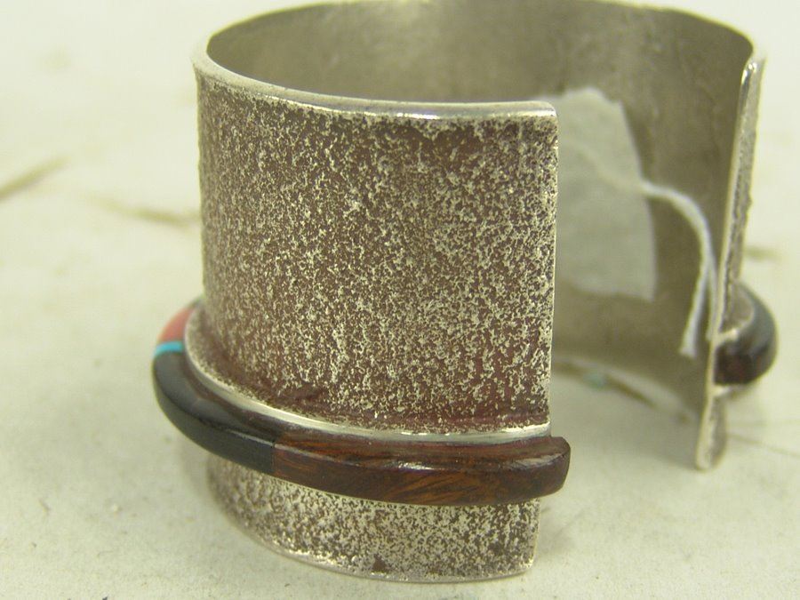 Outstanding, contemporary tufa cast all silver cuff bracelet with a beautiful single red coral stone in a Loloma style bezel on top, and with a row of raised inlay stones. Very good condition.,,5-1/4" + 1" x 1-3/4 "