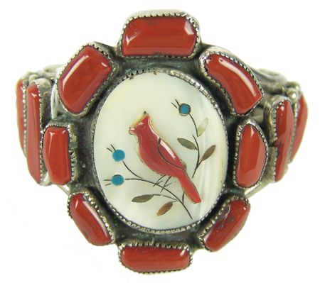 Ca. 1970s, Striking heavy gauge silver cuff bracelet set with 16 exceptional deep red branch coral stones, plus a raised inlay cardinal disc on mother of pearl. Very good condition. 5-1/2" + 1" x 2-1/2"