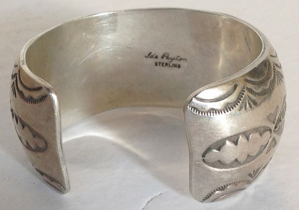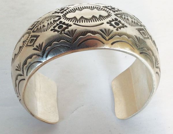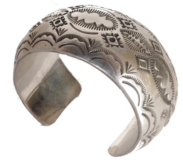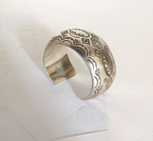Fine, hand stamped, all silver hollowware cuff bracelet with detailed, raised top. Very good condition.Late 1900s5" + 1-1/8" x 1-3/4"