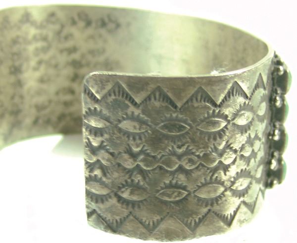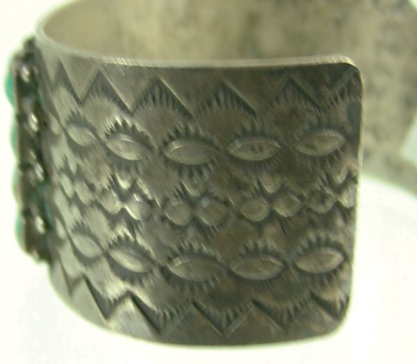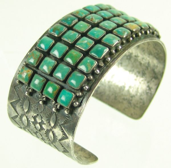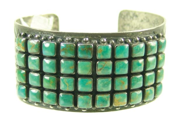 Outstanding, wide, all silver cuff bracelet with 40, hand cut and set, square green turquoise stones. Very good condition.Ca. 1980s5-1/4" + 1-1/2" x 1-3/8"