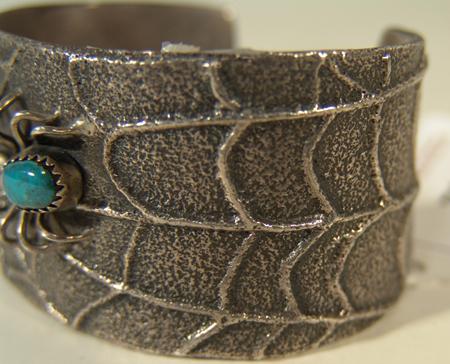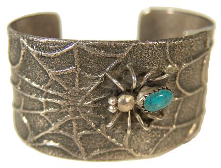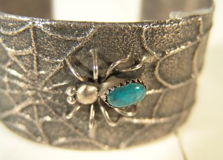 Fabulous cuff bracelet with spiderweb motif and raised spider with turquoise cabochon. Hallmarked. 5-1/4" x 1" x 2-1/4"