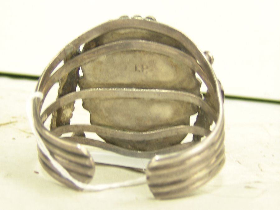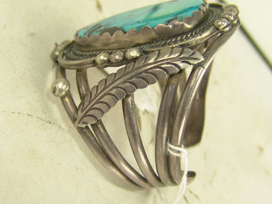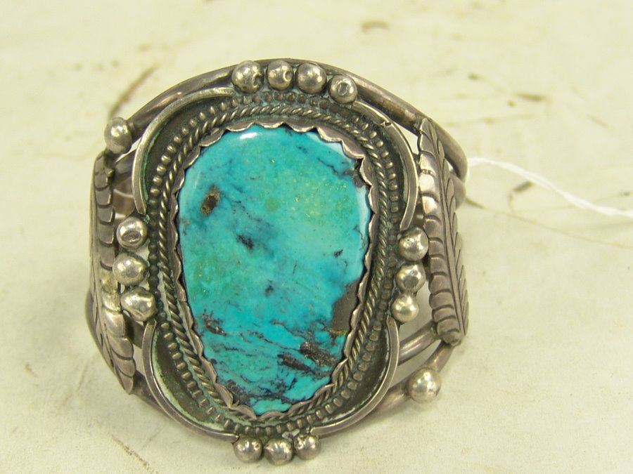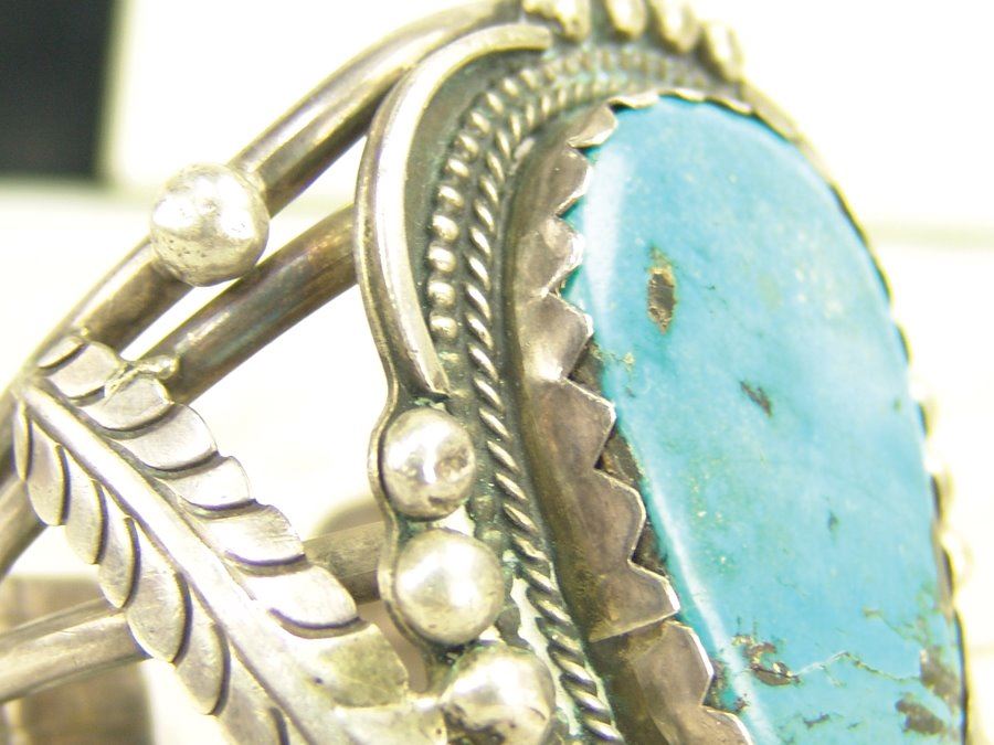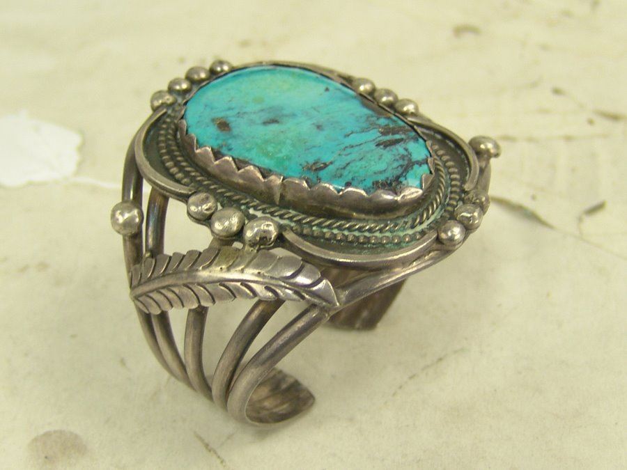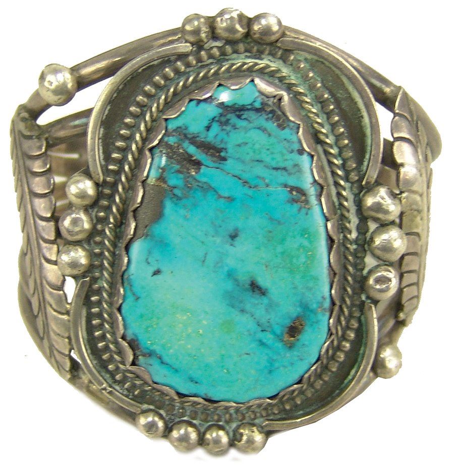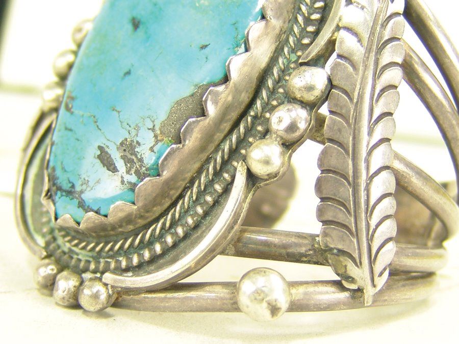 Large heavier gauge all silver five-band bracelet with leaf, dot, and roped details and large beautiful, Blue Diamond turquoise stone. Very good condition, shows some wear.,,7-1/4" + 3/4" x 2-3/4"