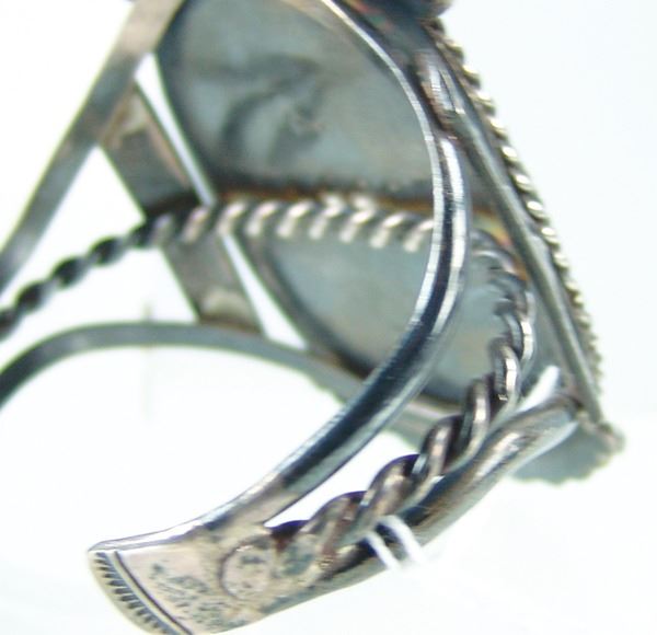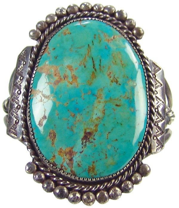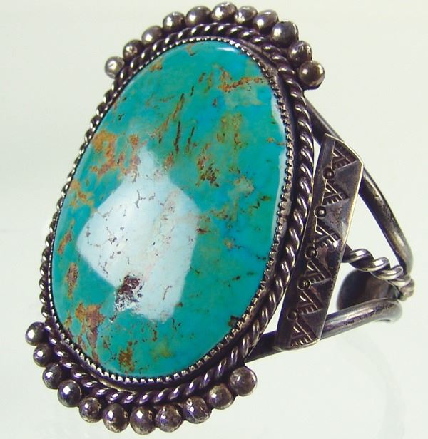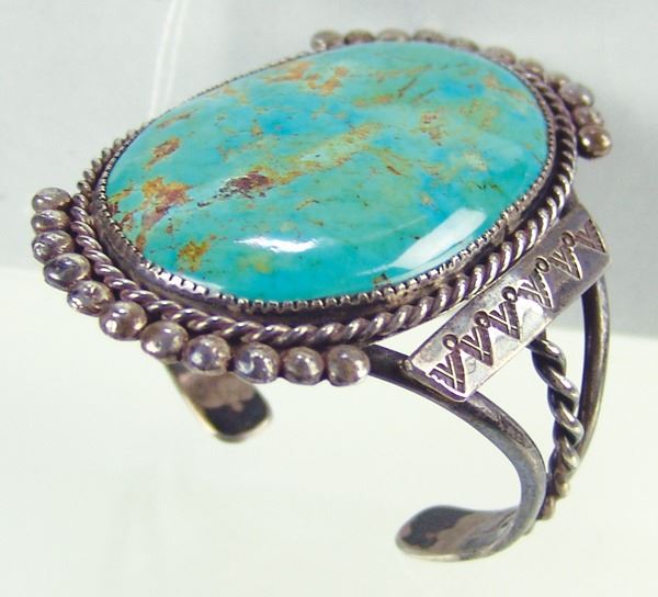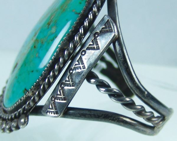 Impressive, handwrought all silver bracelet with classic stamp, file, and rope work details and with a huge, polished Cerrillos turquoise stone. Very good condition.Ca. 1980s6-1/4" + 1" x 4" long