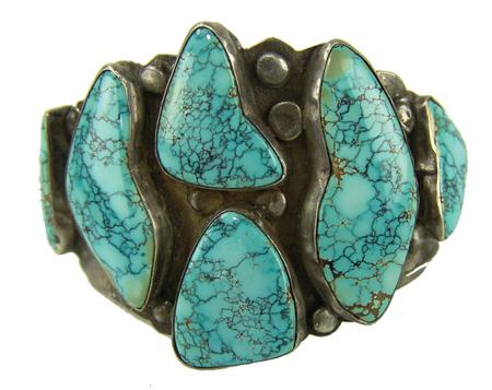 Circa 1960-1970, Beautiful sterling cuff bracelet set with six fine light blue spiderweb turquoise stones. Very good condition. Hallmarked. 5-1/4" x 2" + 1-1/8" gap