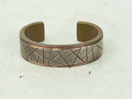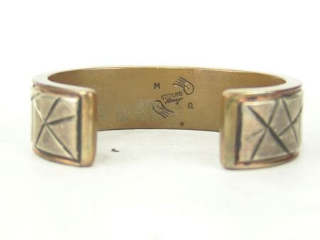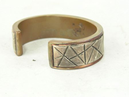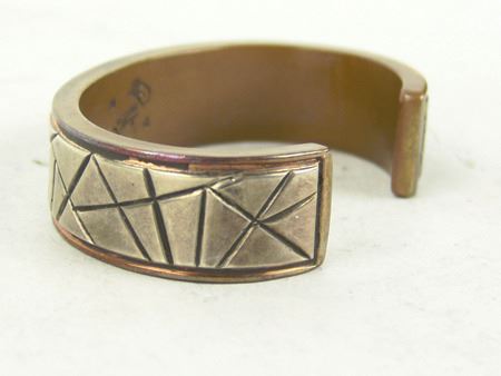 Ca. 1970, Vintage heavy gauge bracelet made of solid silver with therapeutic copper back featuring a simple mosaic brick pattern. Very good condition, signed "MC" (for Father Grover). 5-3/4" x 1-1/4" x 7/8"