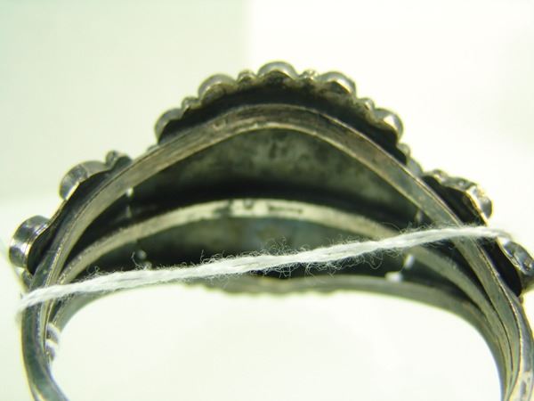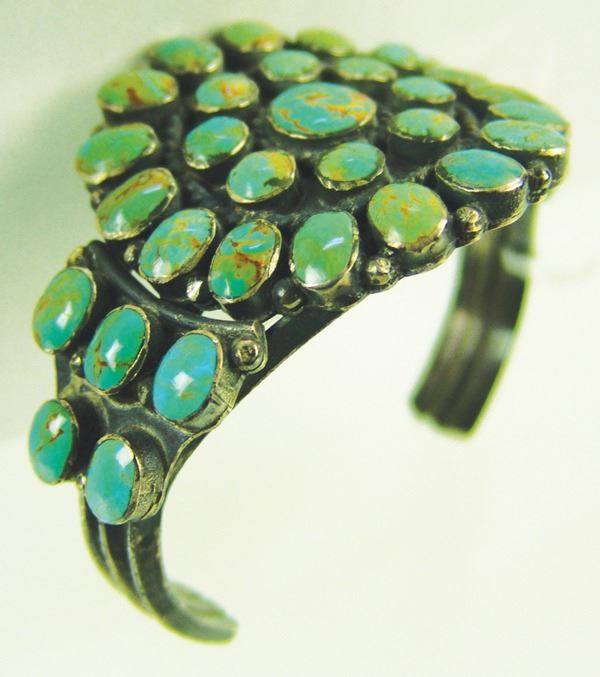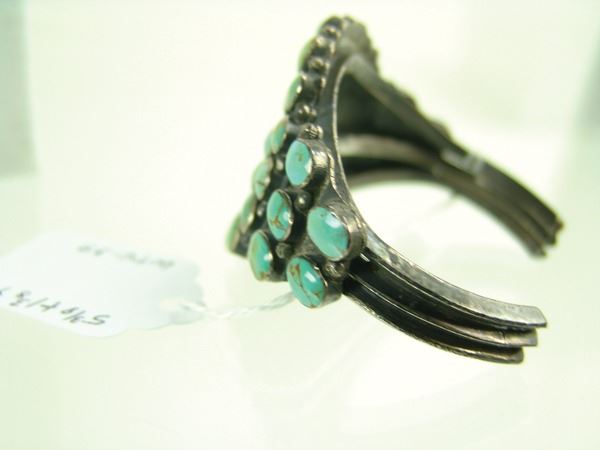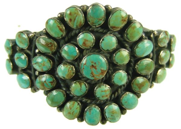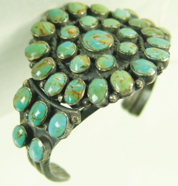 Unique, cluster design, all silver bracelet with 35, individually hand cut and set, Cerrillos turquoise stones. Very good condition.Ca. 1980s5-3/8" + 1-3/8" x 1-3/4"