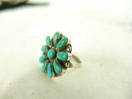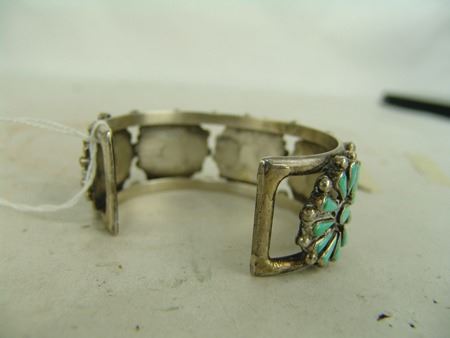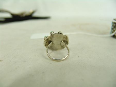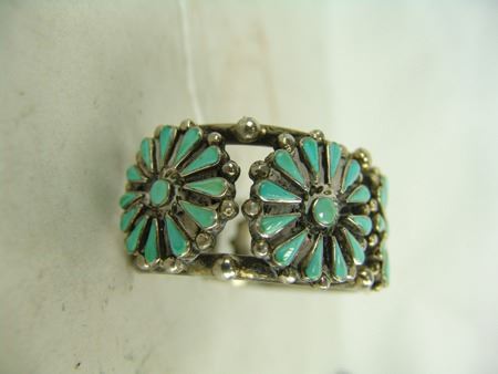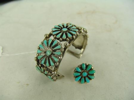 Late 1900s, Classic cluster design all-silver bracelet with five matching rosettes, plus a matching size 5 ring. 5-5/8" + 1-1/2" x 1-1/8"