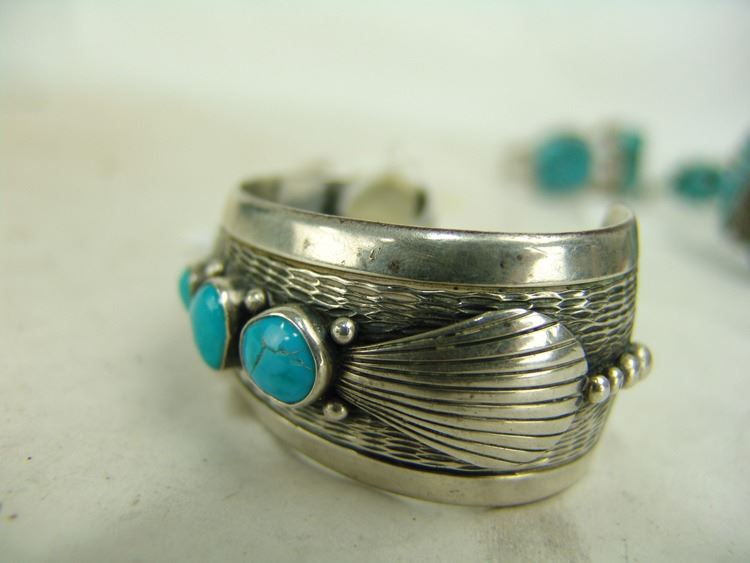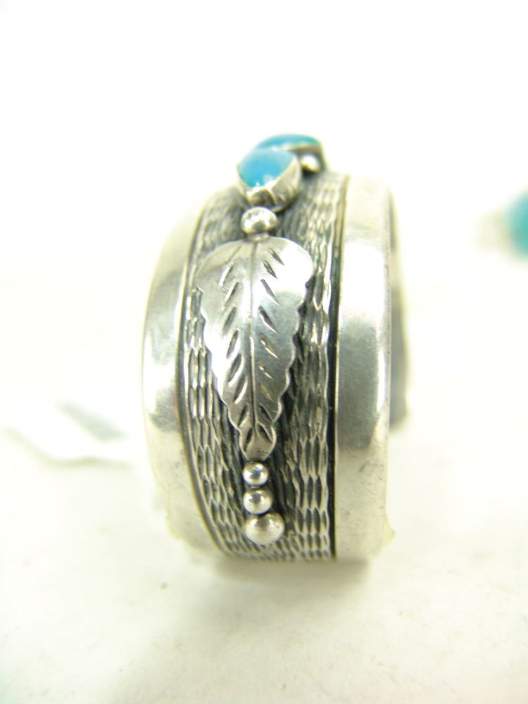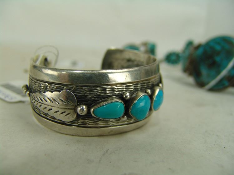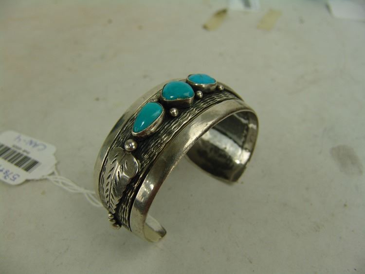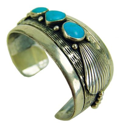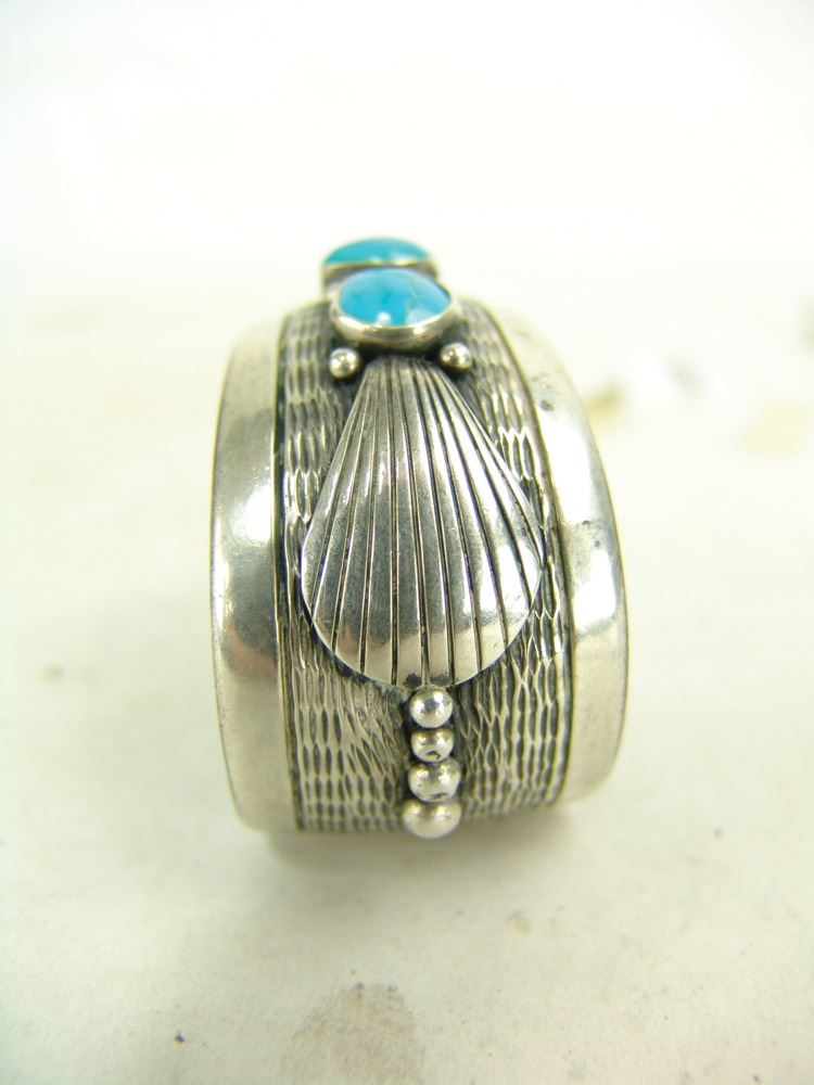 Fine handwrought all silver rounded cuff bracelet with leaf and shell appliques and 3 turquoise stones. Very good condition, backing may be nickel silver.,Early 2000's,5-3/8" + 1-1/4" x 1-1/8"