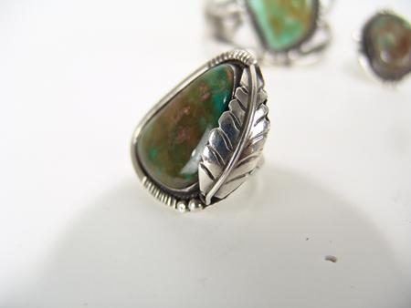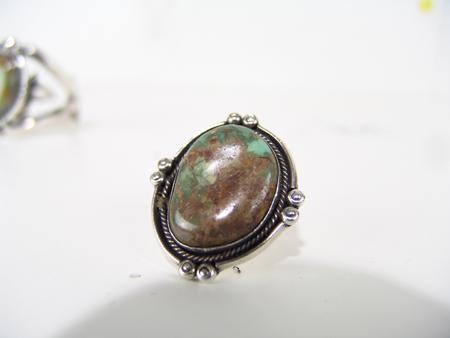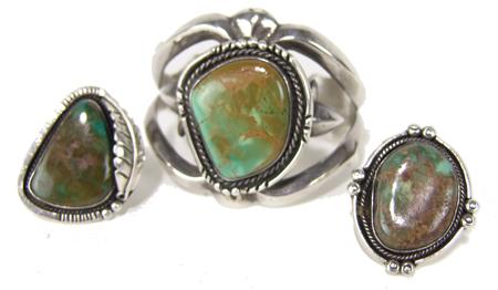 Circa 1980, Beautiful traditional sand cast bracelet and two matching rings, all set with matching green turquoise stones. Very good condition. 5-1/2" x 2-1/4" + 1" gap From the Towne Collection.