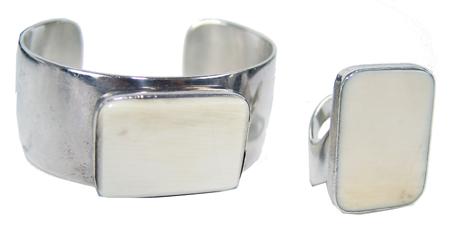 Circa Late 1900s, Fine hand wrought sterling cuff bracelet and matching ring set with ivory stones. Very good condition. 5-3/8" x 1" + 1" gap From the Towne Collection.