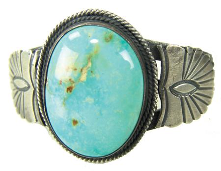 Circa 1980s, Beautiful stamped heavier gauge silver bracelet set with a large single turquoise stone. Very good condition. 5-1/2" x 1-3/4" + 1-1/4" gap