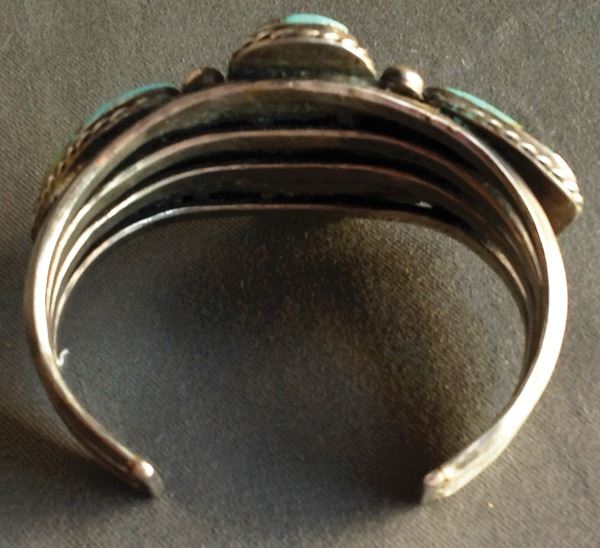 Ca. 1970s-1980s Bracelet 6" + 1-1/2" x 2-1/4" Vintage, (24") turquoise and sliver squash blossom necklace loaded with early mercury dimes, plus a great, heavier gauge three-stone bracelet. Both in very good