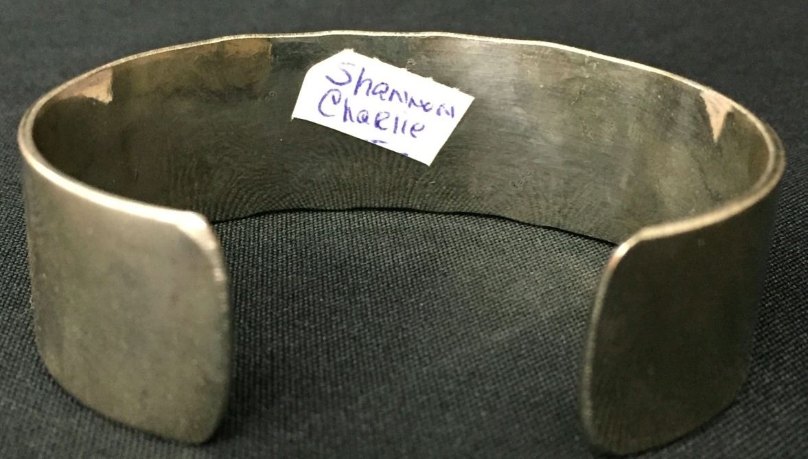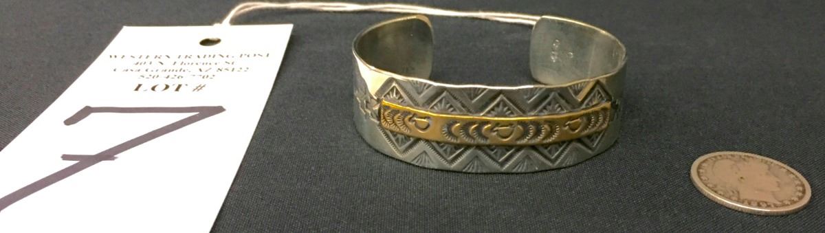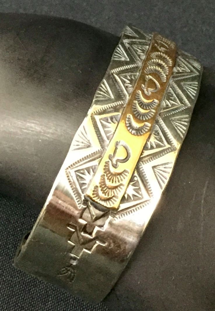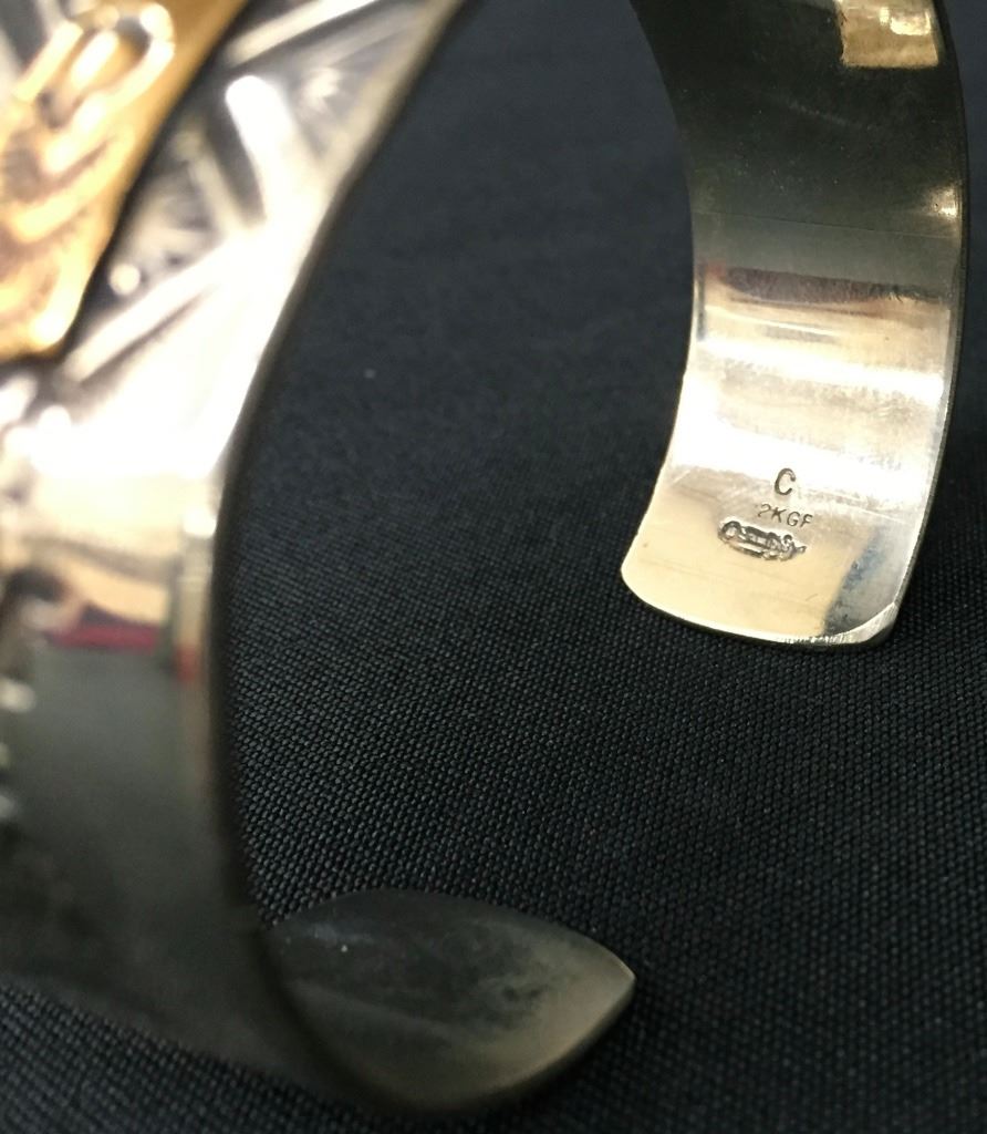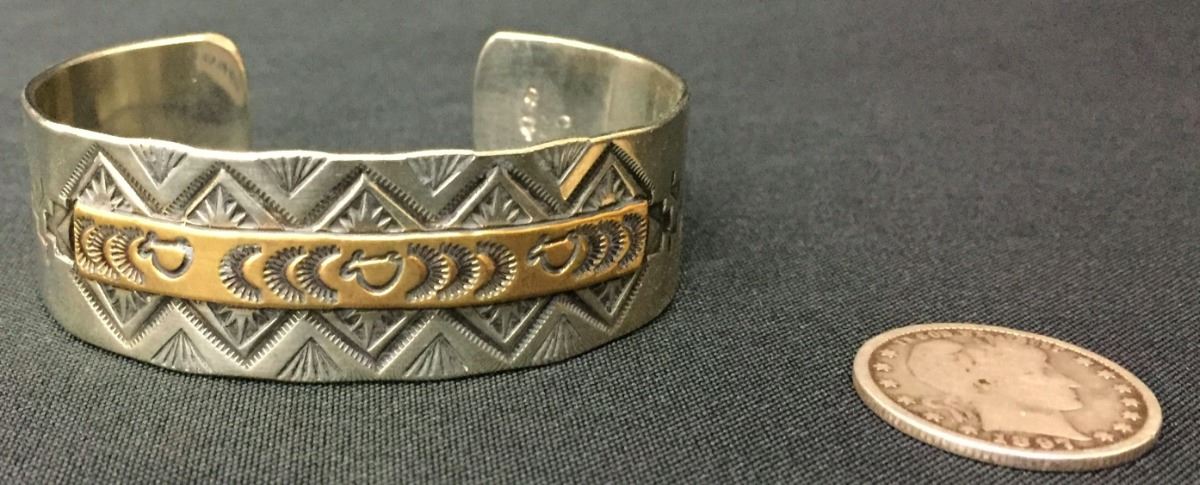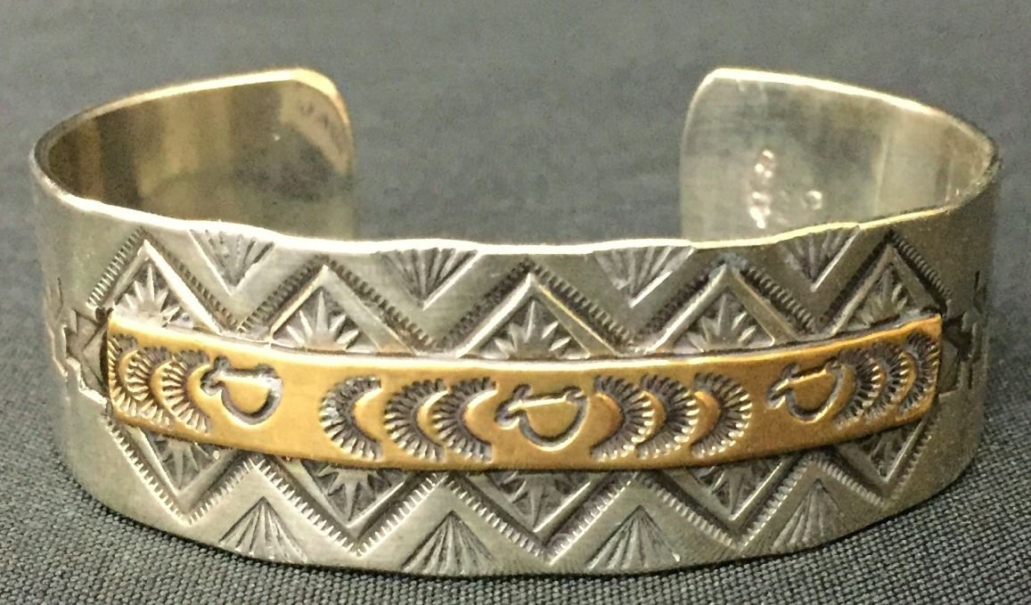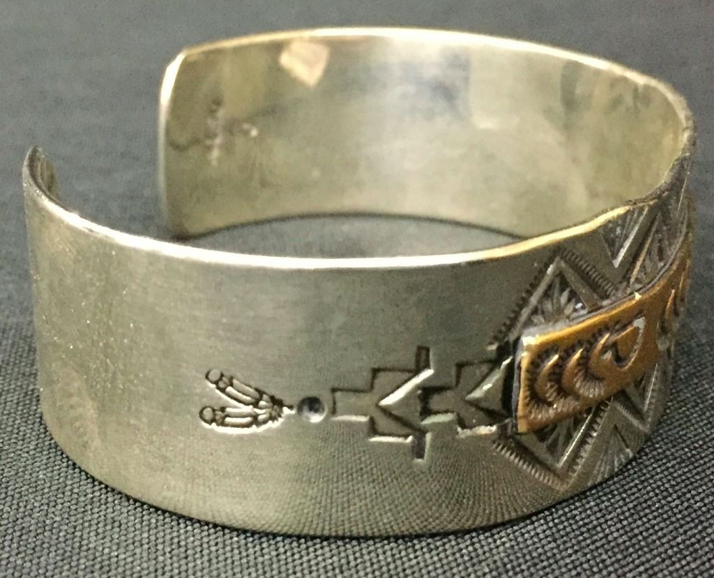 A contemporary sterling silver cuff bracelet with 12K gf overlay by Shannon Charlie (Navajo). Measures just under 6” inside plus there is a 1” opening. It is .75” wide and weighs 34.4g. Like new condition. Please look closely at the pics as they are an important part of our description. Shipping: There will be a $5 handling / packaging fee for shipping this lot. The actual cost of postage will be added on top of that.
