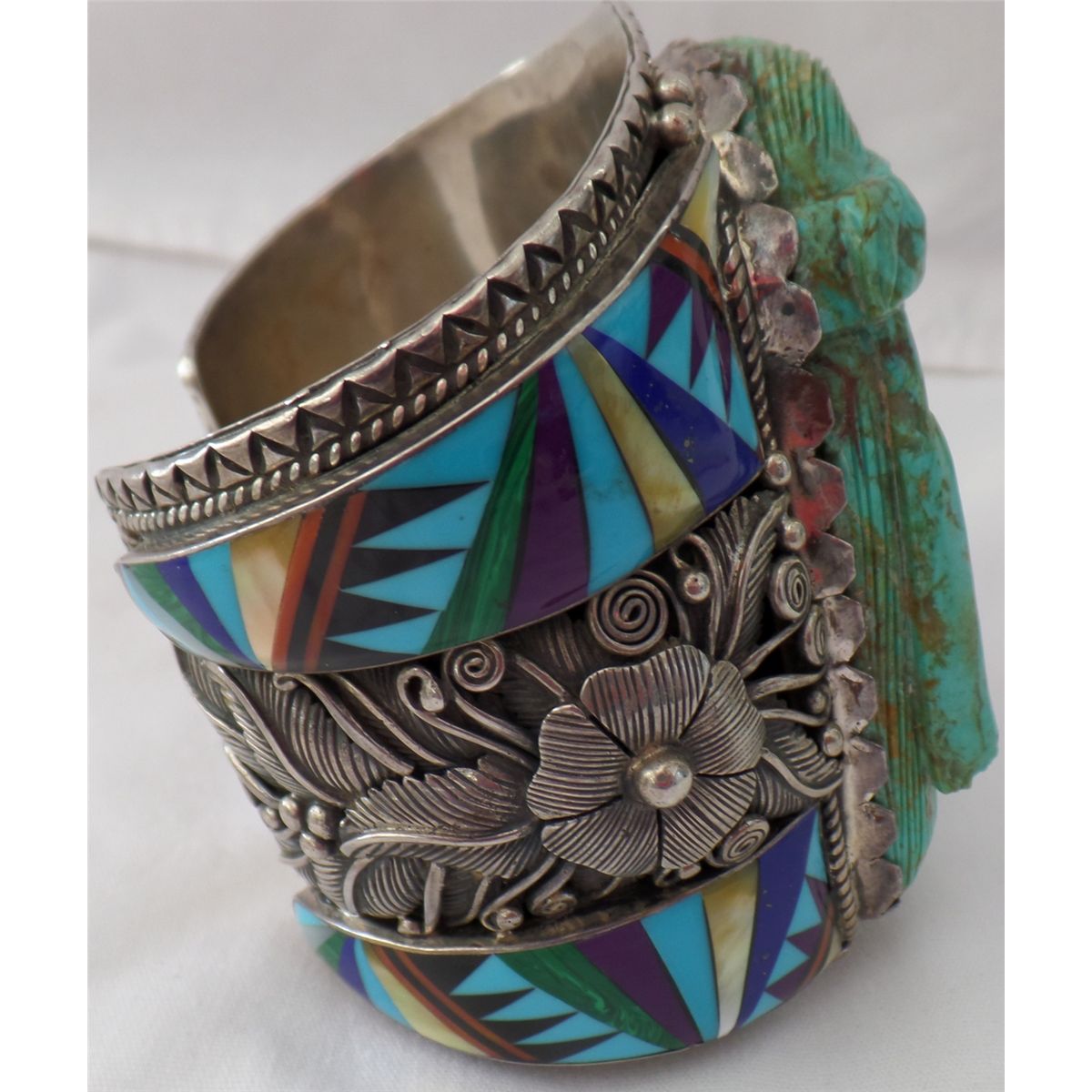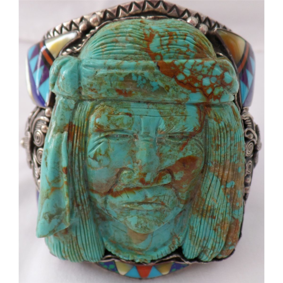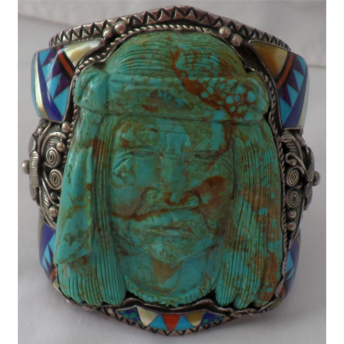 Navajo Bracelet w/Carved Turquoise Face. Item is quite large, measuring 9.5" around x 4" tall. Bracelet has a 1.25" opening. Very fancy work done throughout. Item is STERLING and weighs approx: 384.3 grams. Condition: Good, worn, see images. Shipping: $30.