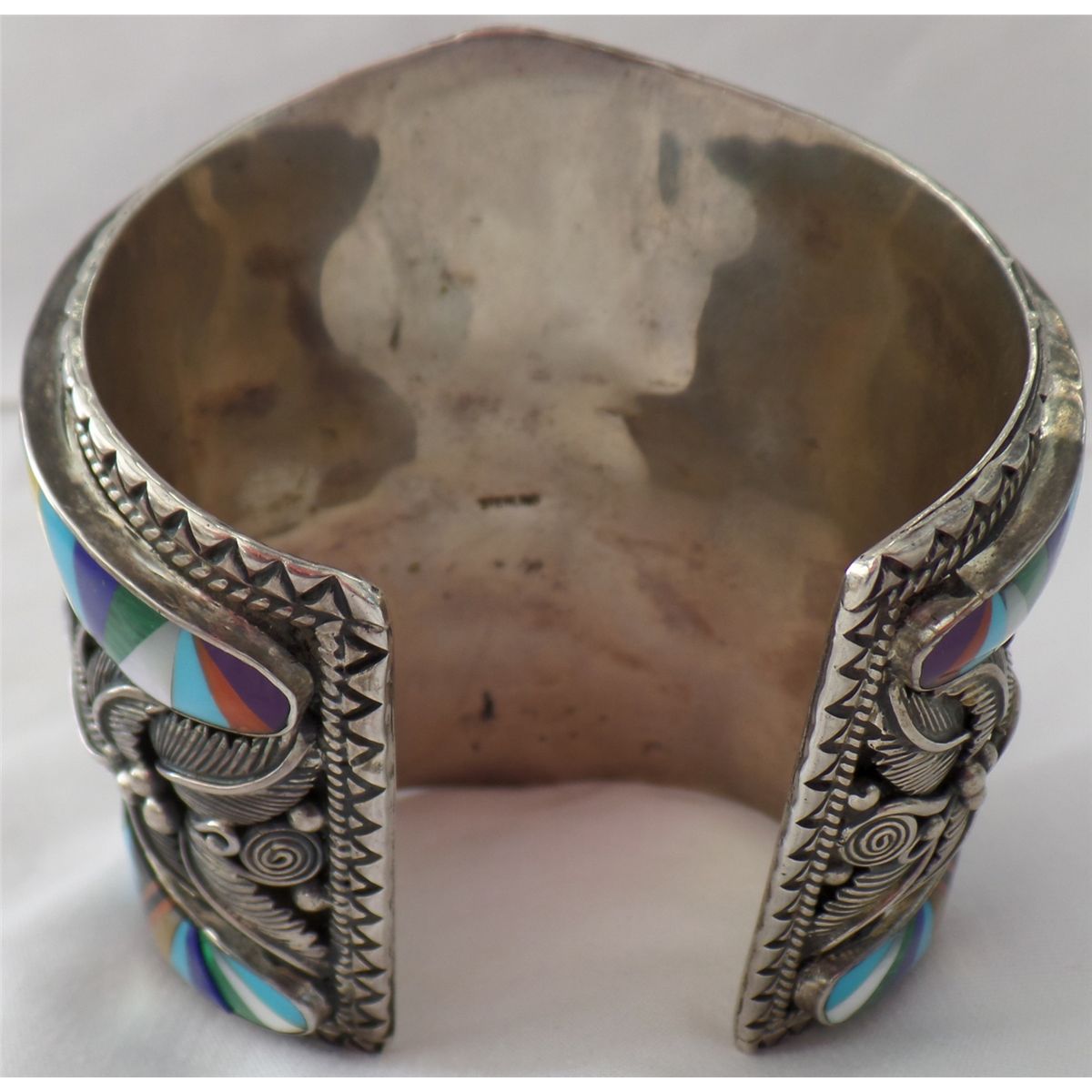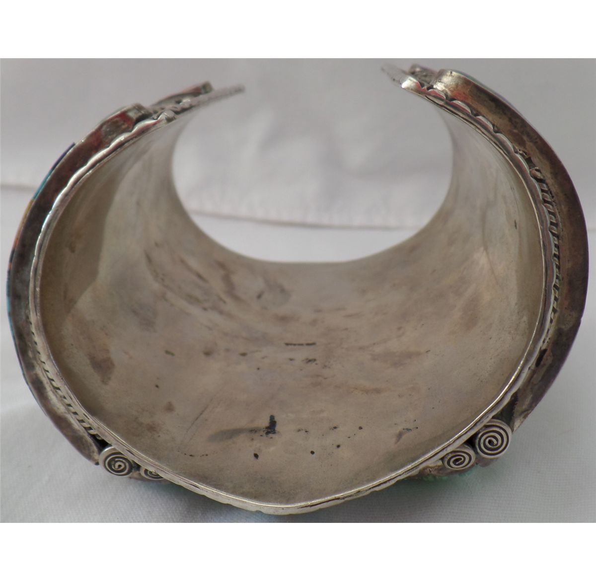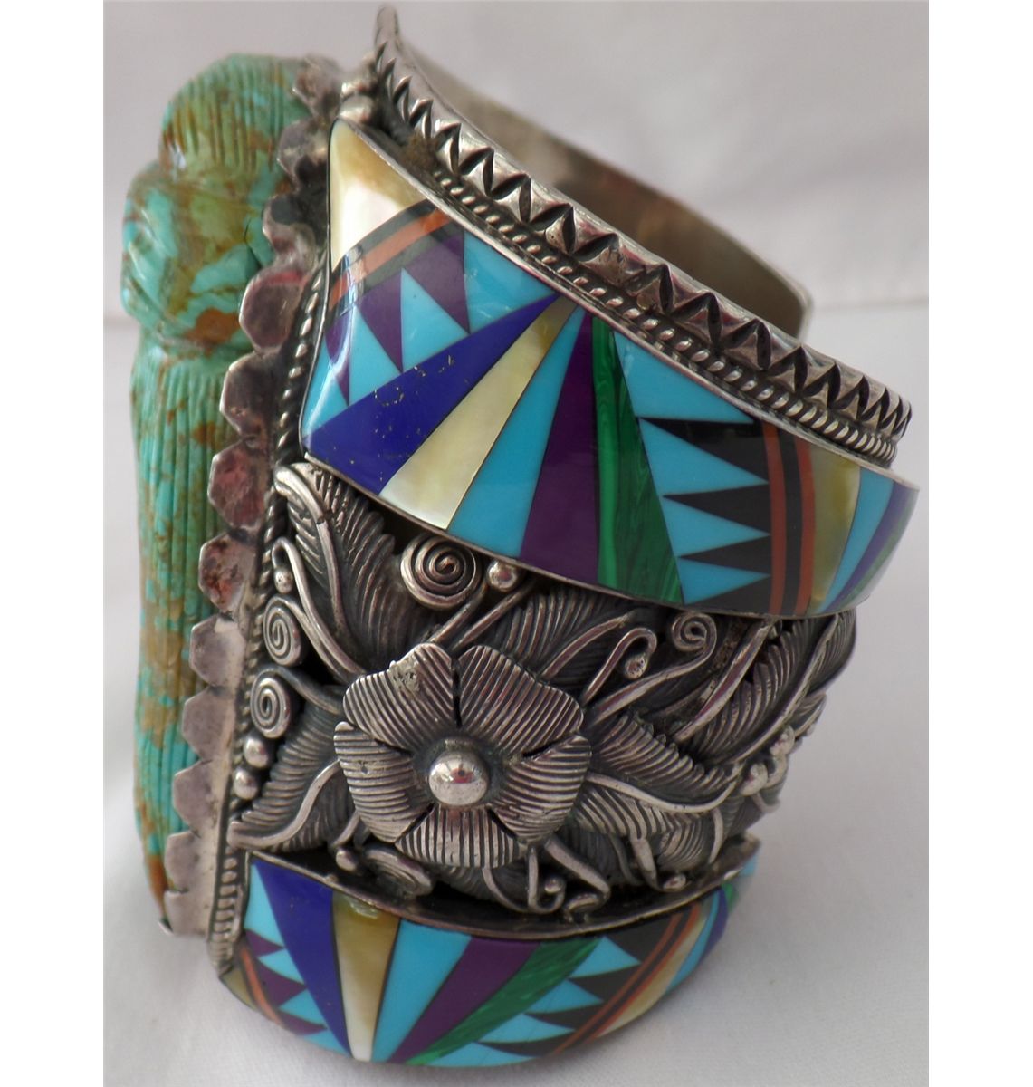 Navajo Bracelet w/Carved Turquoise Face. Item is quite large, measuring 9.5" around x 4" tall. Bracelet has a 1.25" opening. Very fancy work done throughout. Item is STERLING and weighs approx: 384.3 grams. Condition: Good, worn, see images. Shipping: $30.