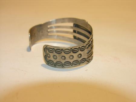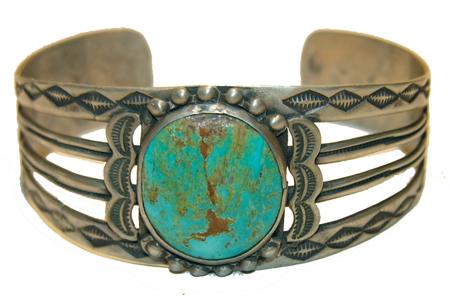 Circa Mid 1900s, Four band cuff with stamping and a central natural Royston turquoise cabazon. 6-1/4" x 1-3/8" + 1" gap