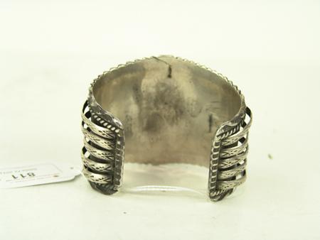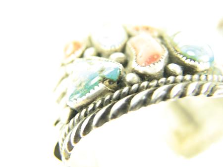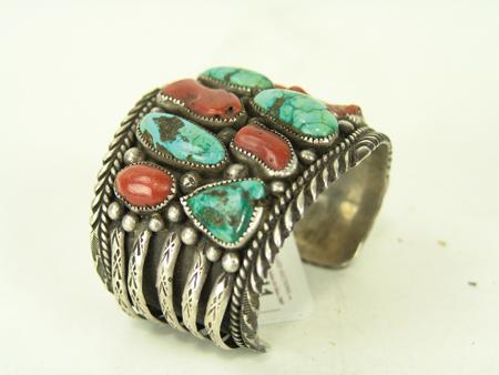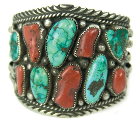 Circa 1970s, Unique design wide silver cuff bracelet with five turquoise and five coral stones. Good wearable condition with some bezel missing from two stones. 6" x 2-1/2" + 1-1/2" gap