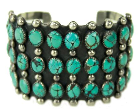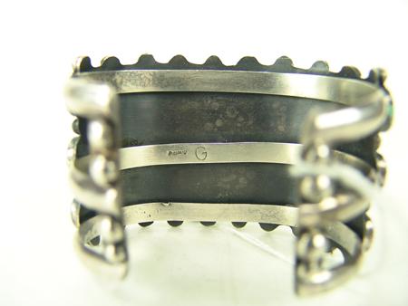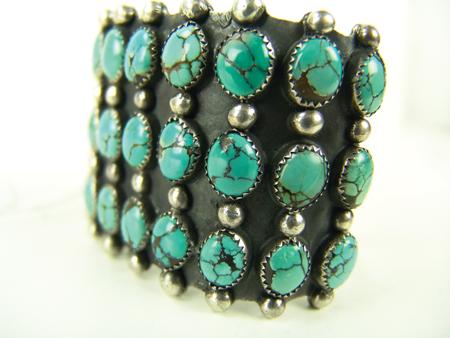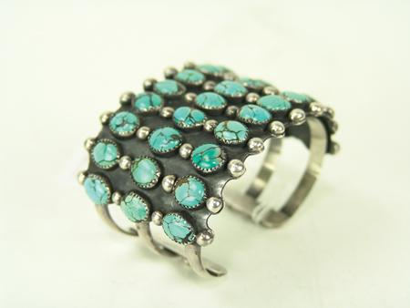 Circa 1980, Beautiful silver cuff bracelet with 30 individually cut and polished matching turquoise stones. Very good condition, signed "G." 5-7/8" x 2" + 1-1/4" gap
