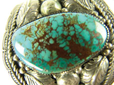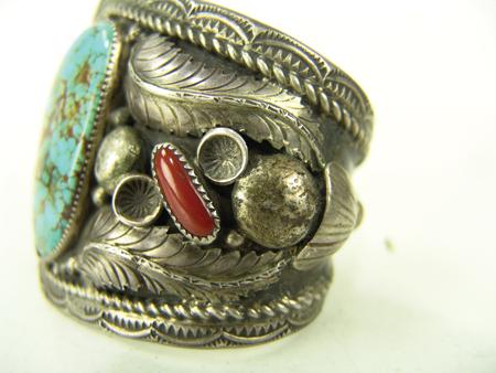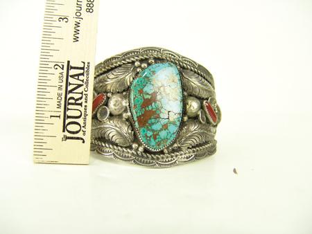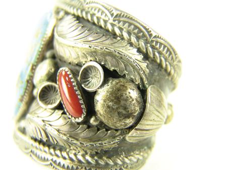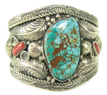 Circa 1970s, Wide and sturdy silver cuff bracelet with  elaborate leaf and scroll work and set with a  single large turquoise stone (intact but with  cracks) and two corals.  Very good condition. 6-1/2" x 2-1/2" + 1-1/2" gap