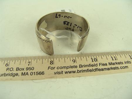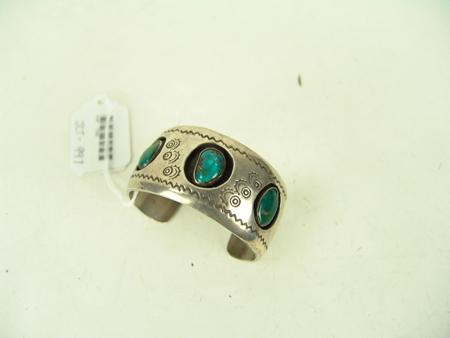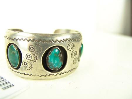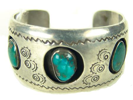 Circa 1970s, Classic shadowbox design all silver hollowwork  bracelet set with three aged turquoise stones.   Very good used condition. 5-1/2" x 1-1/4" + 1-1/4" gap