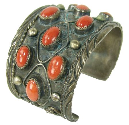 Ca. 1970s, Classic wide all-silver cuff bracelet with fine scroll and wire work, set with ten oxblood red coral stones. Very good condition, with nice patina. 5-1/2" + 1-1/4" x 1-3/4"