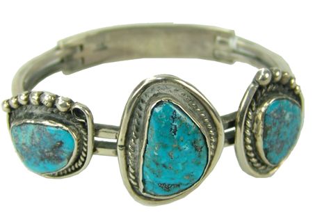 Late 1900s, Hand wrought heavier gauge all-silver bracelet with three turquoise stones and unique clasp on back. Good condition. 7" x 1-1/4"