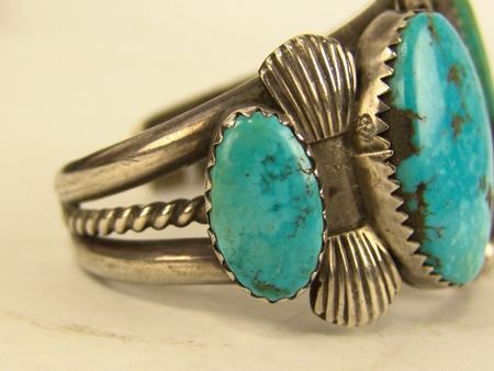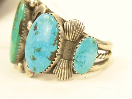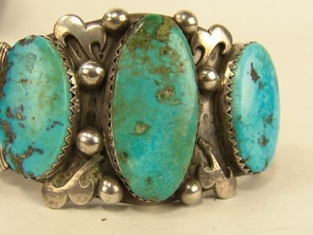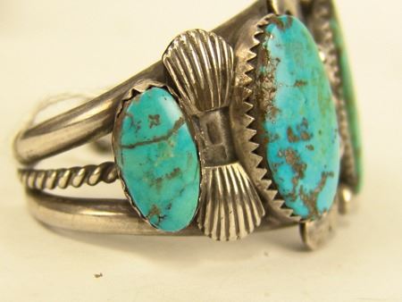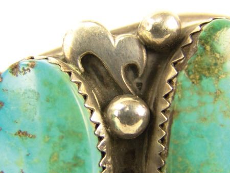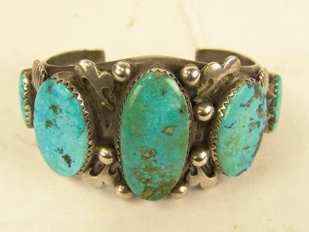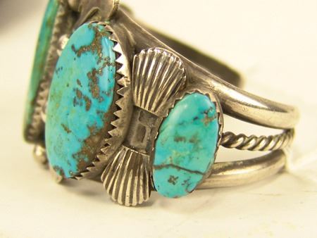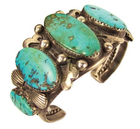 Ca. 1960s, Classic five-stone turquoise and silver bracelet with unique applied fleur-de-lis and shell features. Good usable condition, probably with some replaced stones (one with a crack). 5-3/4" + 1-1/4" x 1-3/4"