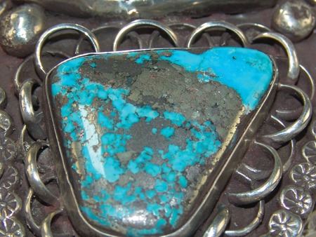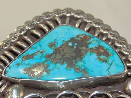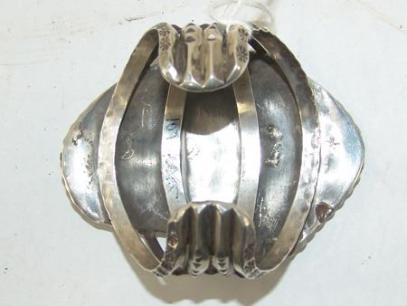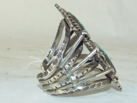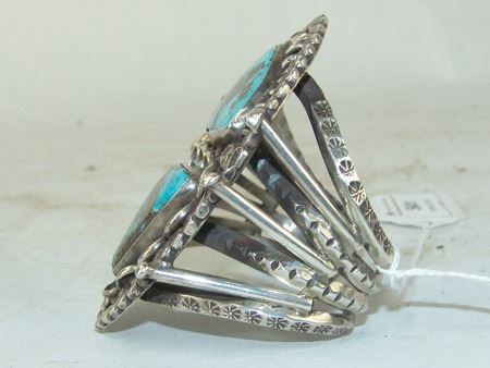 Ca. 1970s, Large and impressive heavier gauge four band all-silver platform bracelet with unique design and two large Morenci turquoise stones. Very good condition. 5-3/4" + 1-1/8" x 3-5/8"