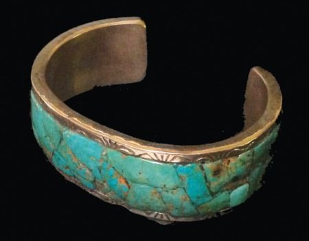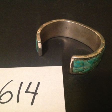Late 1900s, Vintage silver and inlaid turquoise cuff bracelet with stampwork. Good condition. 5-1/2" + 1-1/4" x 7/8"
