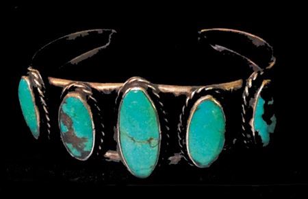Ca. 1960s, Great old pawn Navajo silver bracelet set with five oval-shaped turquoise stones. 5-1/2" + 1" x 7/8"