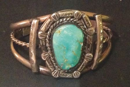 Ca. 1970s, A great Old Pawn piece - a single large-stone turquoise bracelet. Good, used condition. 5" + 1-1/2" X 1-1/2"