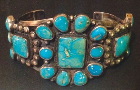 Ca. 1950s-1960s, Great Old Pawn heavy gauge all-silver and turquoise bracelet set with bright blue stones. Great collectors piece! 5" + 1-1/4" x 1-1/2"