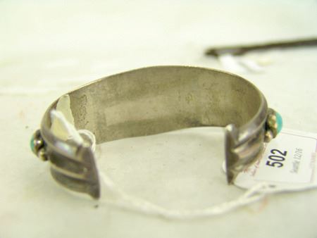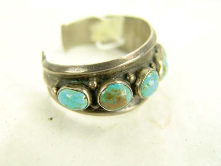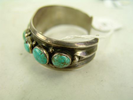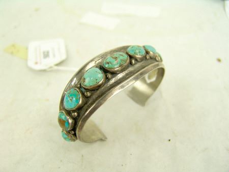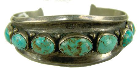 Ca. 1960s, Heavier gauge sand cast all-silver cuff bracelet with nine matching Cerrillos turquoise stones. Very good condition, nice patina. 5-3/4" + 1-3/8" x 1-1/8"