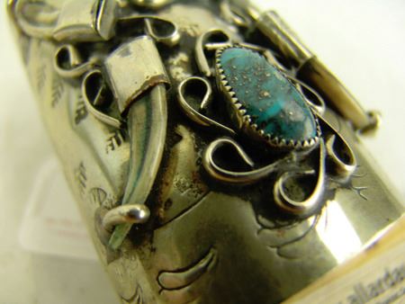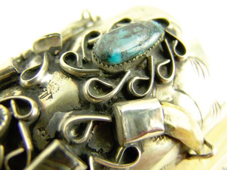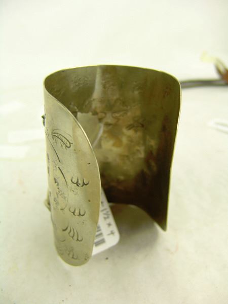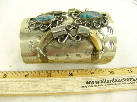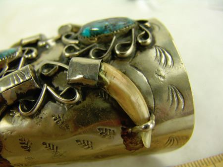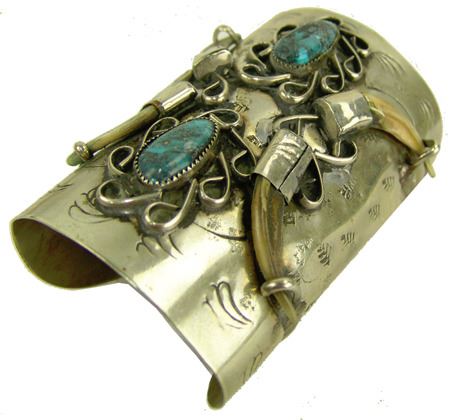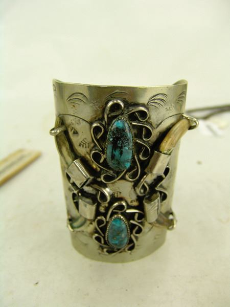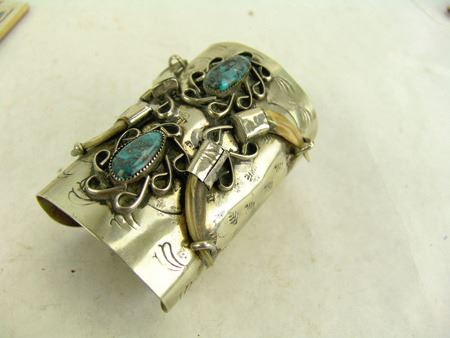 Ca. 1970s, Rather long silver and nickel silver ketoh-style cuff bracelet with stamp and scroll work, four claws, and two turquoise (?) stones. 6" + 1-1/2" x 4"