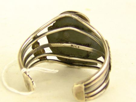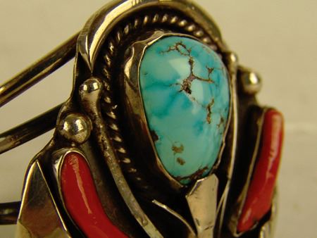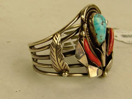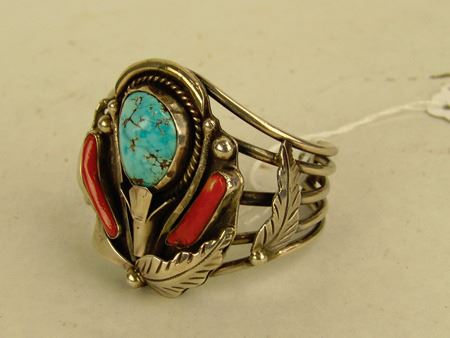 Ca. 1970s-1980s, Beautiful five-band turquoise, coral, and silver bracelet with unique floral/squash blossom design. Very good condition, unsigned. 5-1/2" +1" x 2-1/4"