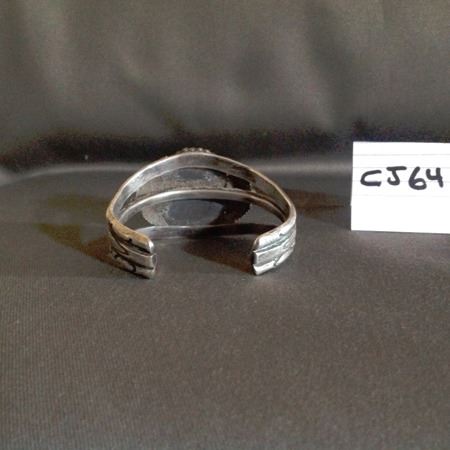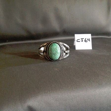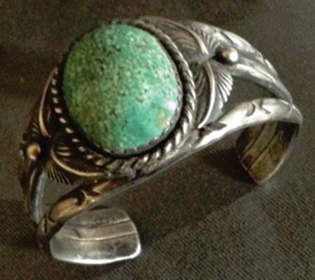 Ca. 1960s-1970s, Heavier gauge all-silver three-band bracelet with large single turquoise stone. Very good condition. 5" + 1-1/8" x 1-1/2"