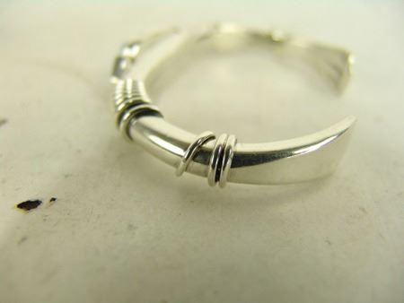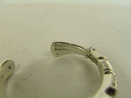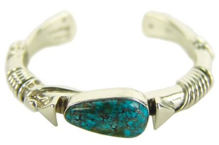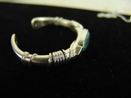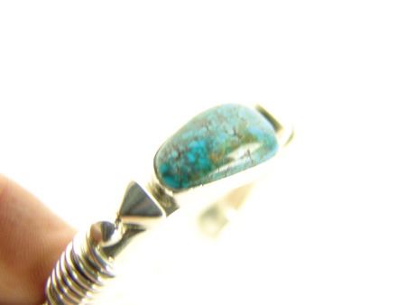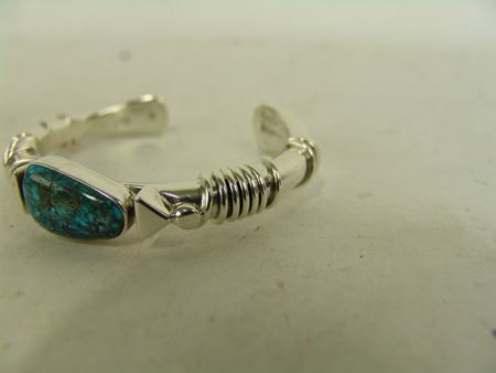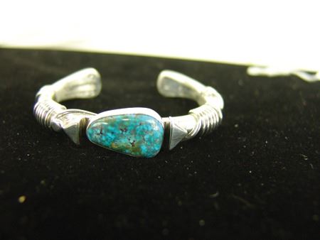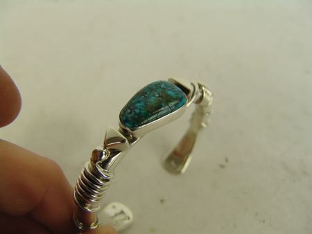 Late 1900s, Original design heavy solid silver bracelet with wire-wrapped sections flanking a beautiful Pilot Mountain (?) turquoise stone. Excellent condition. 5-1/4" + 1" x 1/2"