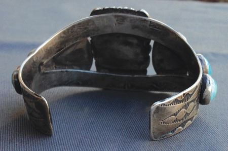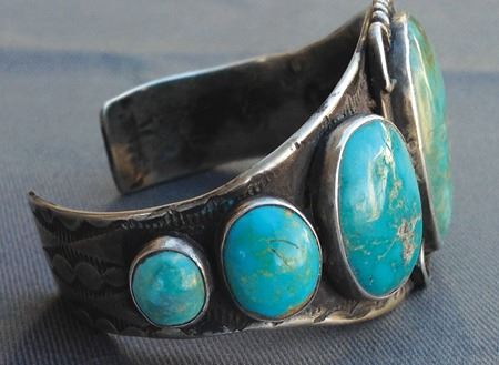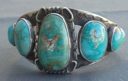 Ca. 1950s-1960s, Beautiful silver band bracelet with seven natural turquoise stones. 5-7/8" + 1-3/8" x 1-1/2"