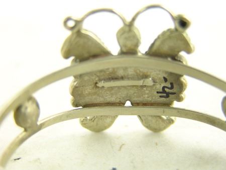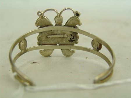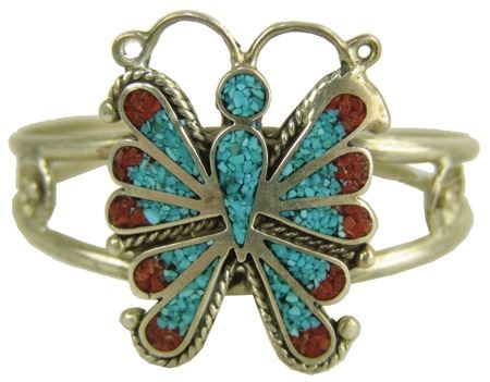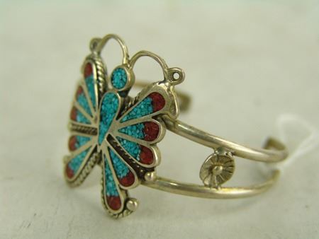 Ca. 1980s, Fine turquoise, coral, and silver chip inlay ladies' butterfly bracelet. Very good condition, unsigned. 5-3/8" + 1-1/8" x 1-1/2"