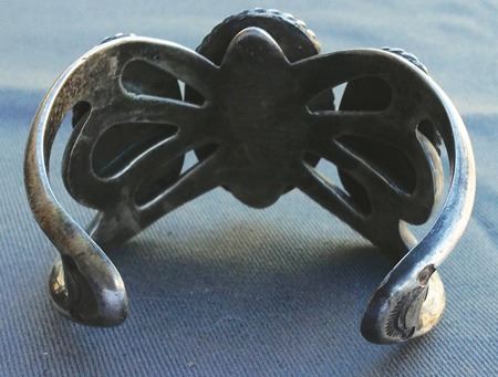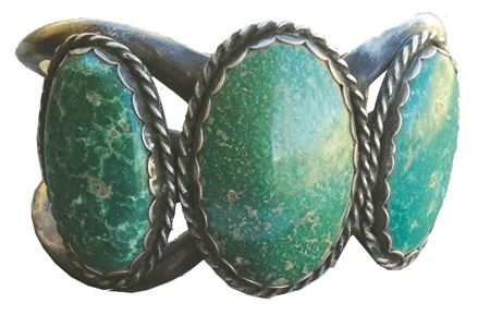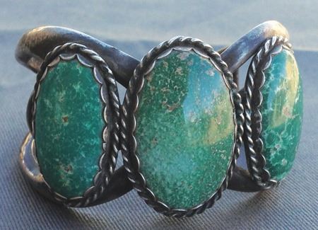 Ca. 1950s-1960s, Wonderful sand cast all-silver cuff bracelet with three large Nevada green turquoise stones in roped and scalloped bezels. Very good condition. 5-1/8" + 1-1/4" x 1-1/2"