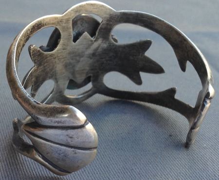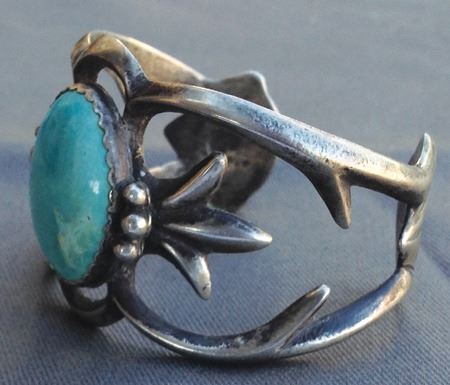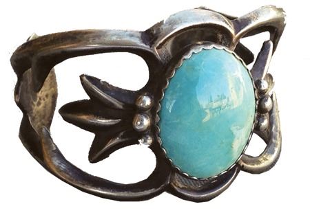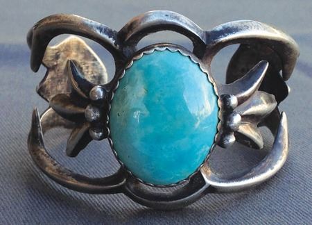 Ca. 1960s, Vintage sand cast all-silver cuff bracelet with bright blue natural turquoise stone. Very good condition. 5" + 1-1/4" x 1-1/2"