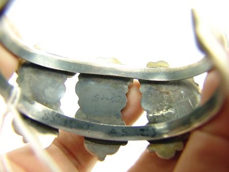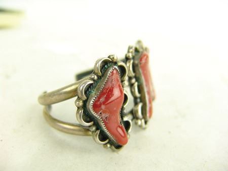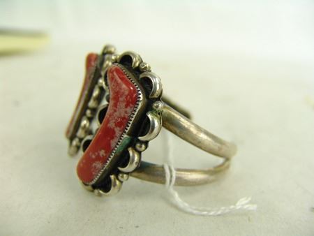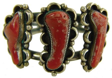 Ca. 1970s, Classic hand wrought all-silver bracelet with three natural contour oxblood coral stones. Very good condition, some haze(?) on the stones. Signed "C.M.S." 5-1/2" + 1-1/8" x 1-5/8"