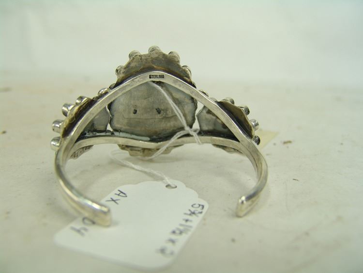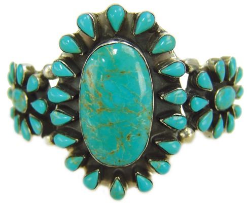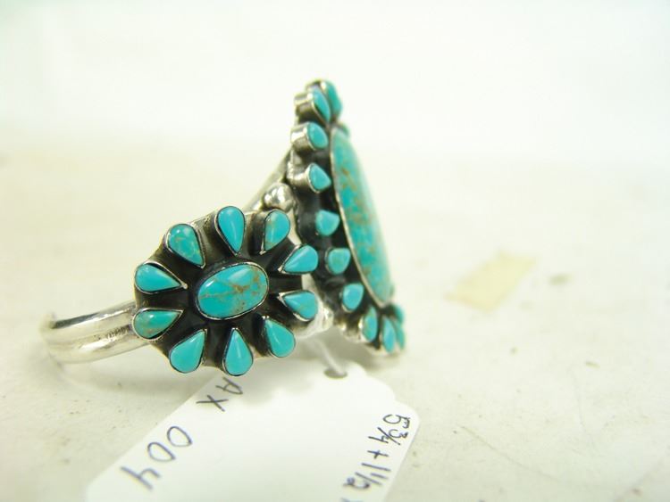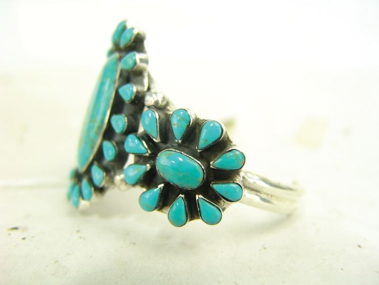 Large cluster design turquoise and silver bracelet made from three silver bands, with 50 round and one oval turquoise stones. Very good condition, unsigned.,Ca. 1960s-1970s,5-3/4" + 1-1/4" x 2-3/4"