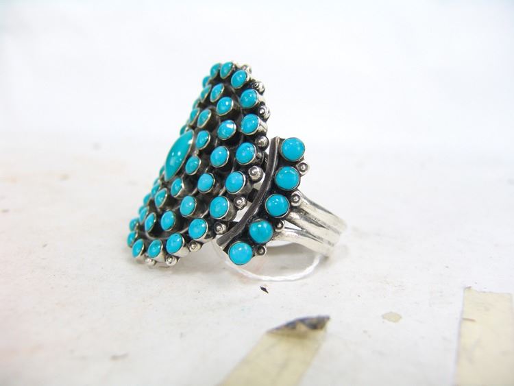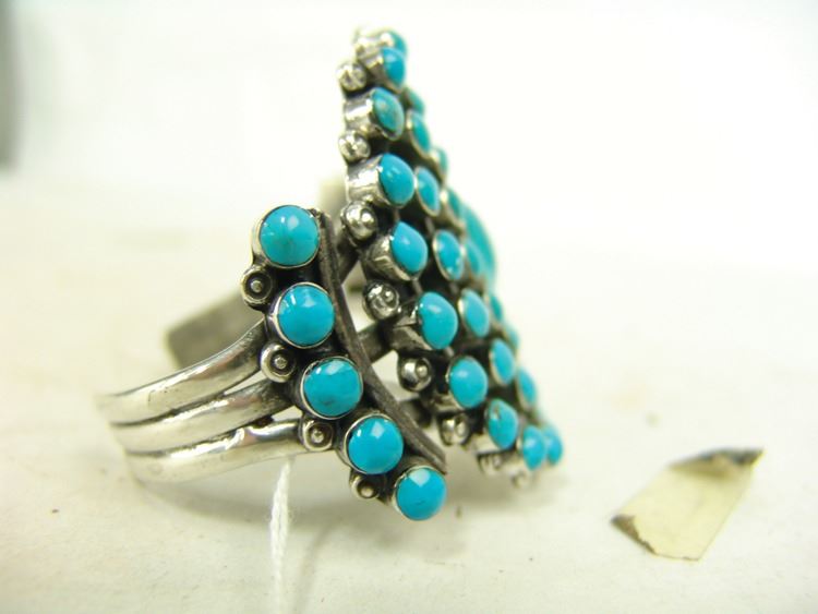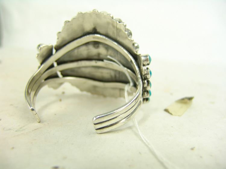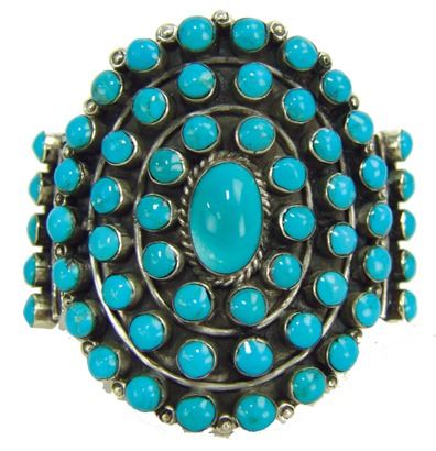 Beautiful cluster design turquoise and silver bracelet. Very good condition, unsigned.,Ca. 1960s-1970s,5-3/4" + 1-1/2" x 2"