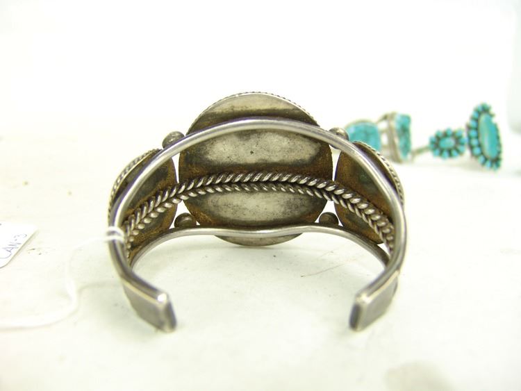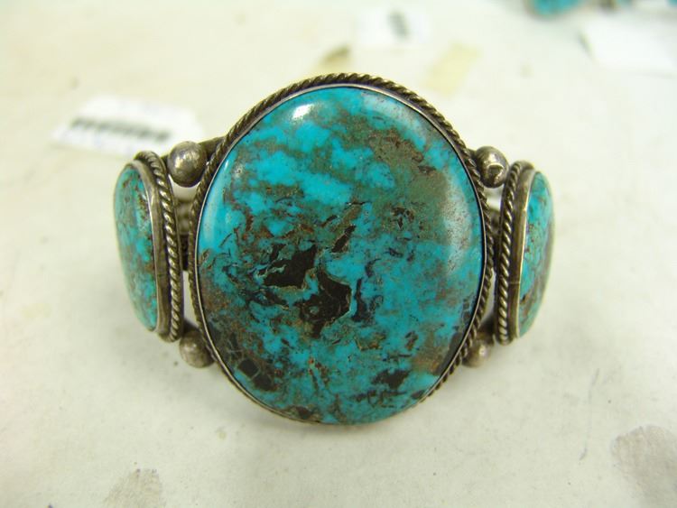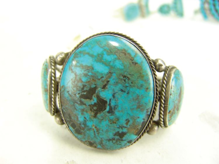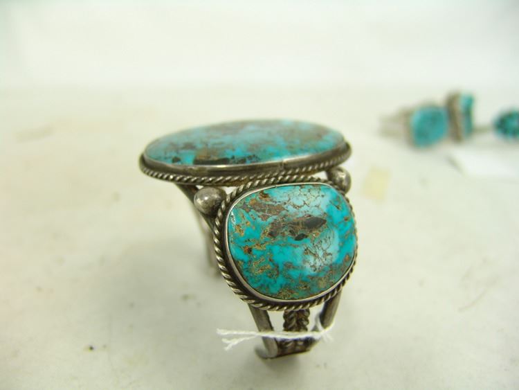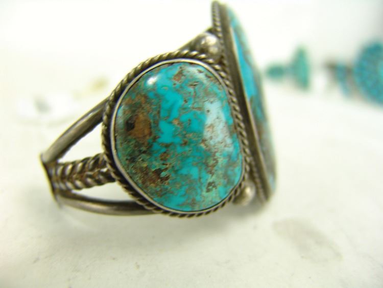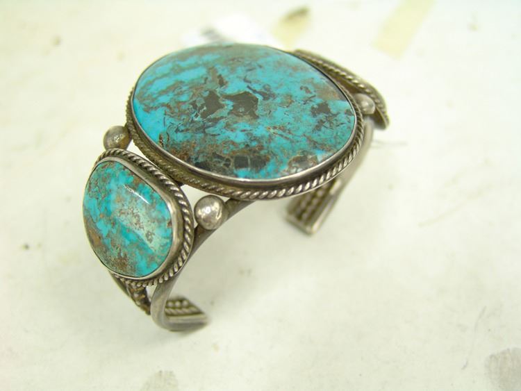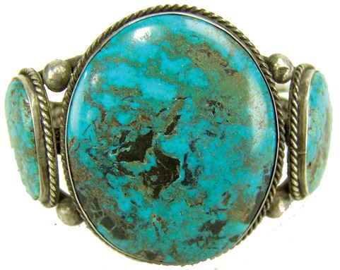 Large all silver bracelet made from two round and two twist bands and with three beautiful large matching Pilot Mountain turquoise stones. Very good condition, unsigned.,Ca. 1970s,5-3/4" + 1-5/8" x 1-1/2"