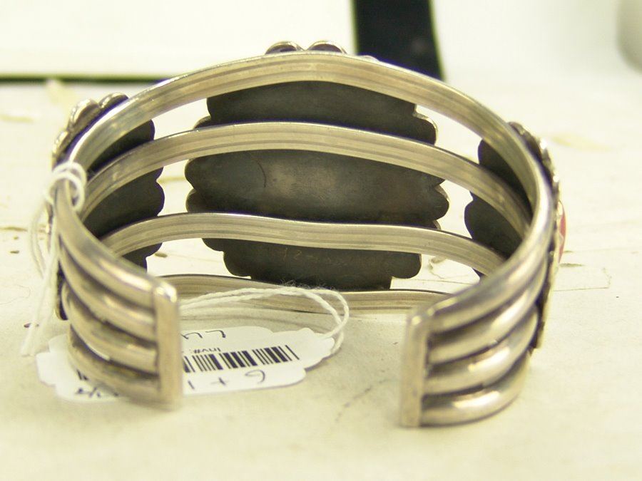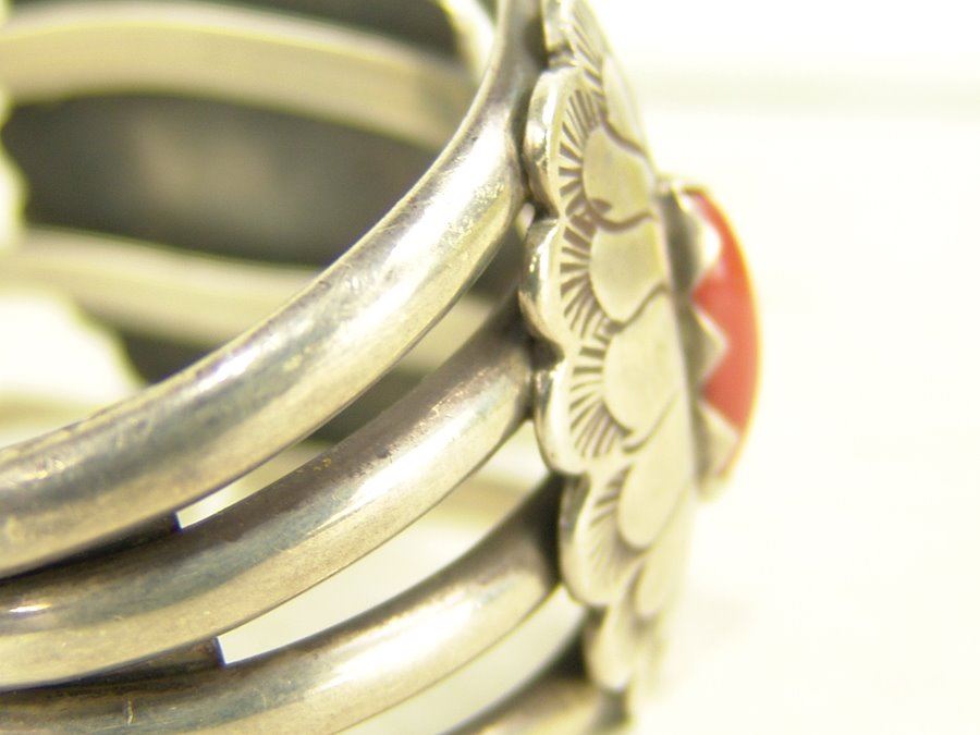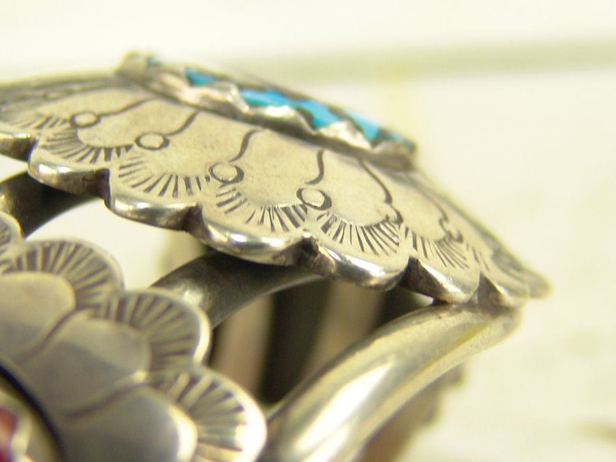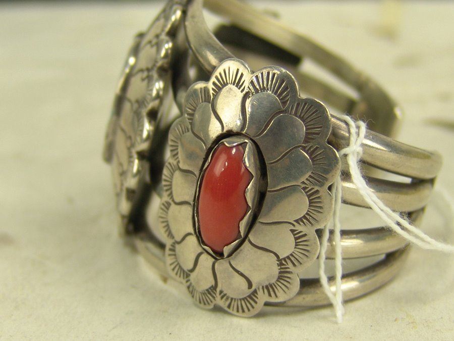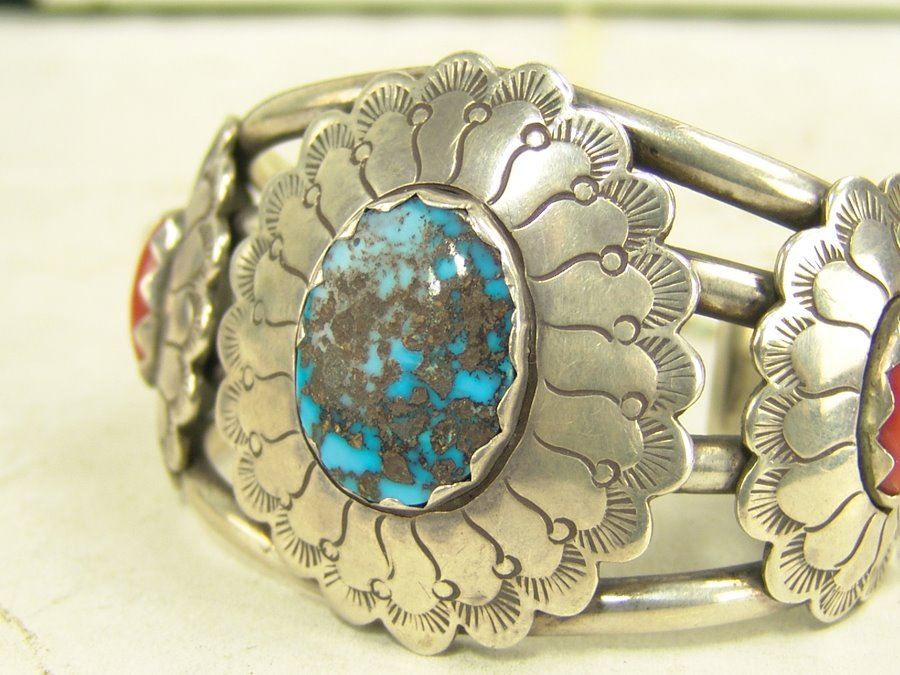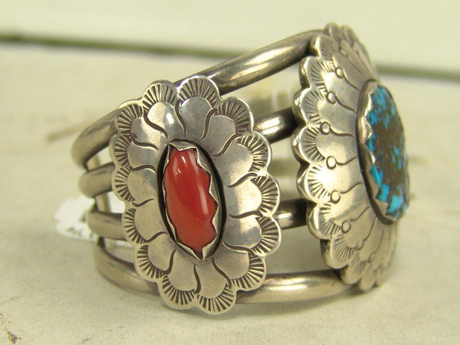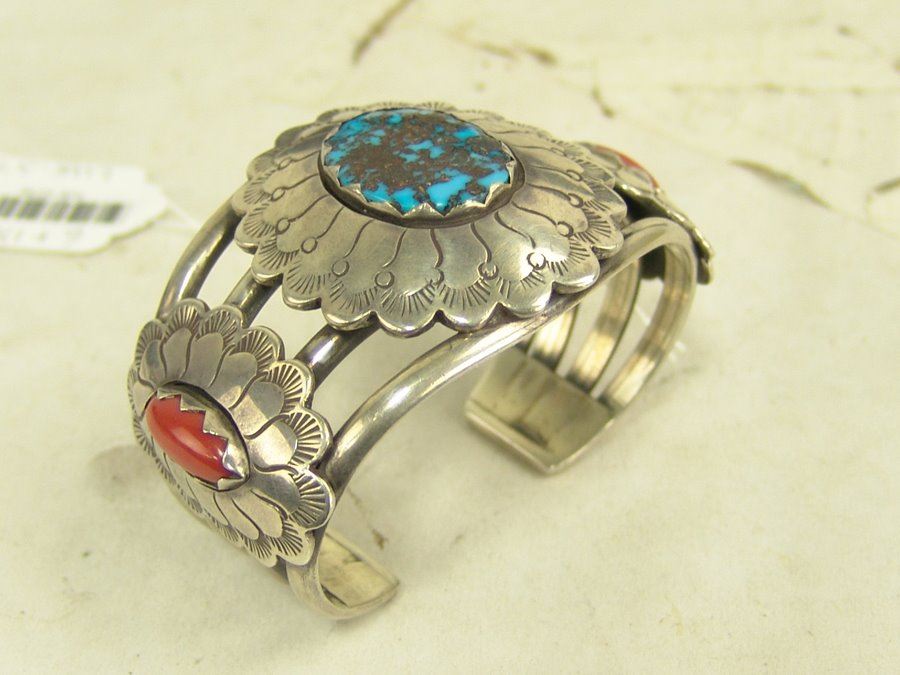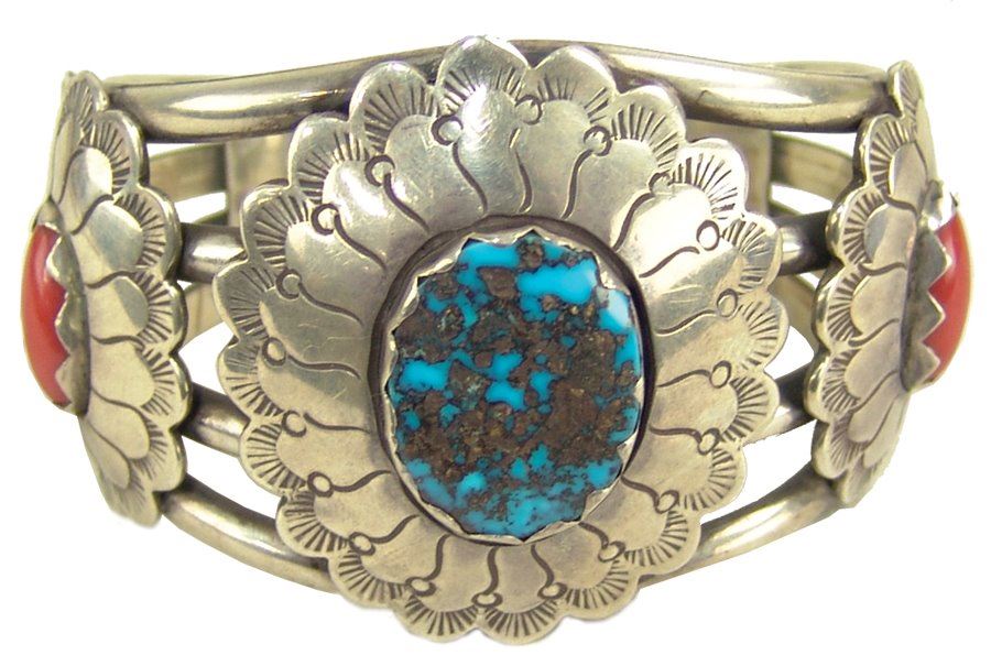 Heavier gauge four-band all silver cuff bracelet with three raised shadowbox style scalloped medallions with artistic stamp work, framing a large Morenci turquoise stone and two smaller corals. Very good condition,,Ca. 1970s,6" + 1-1/8 " x 1-7/8 "
